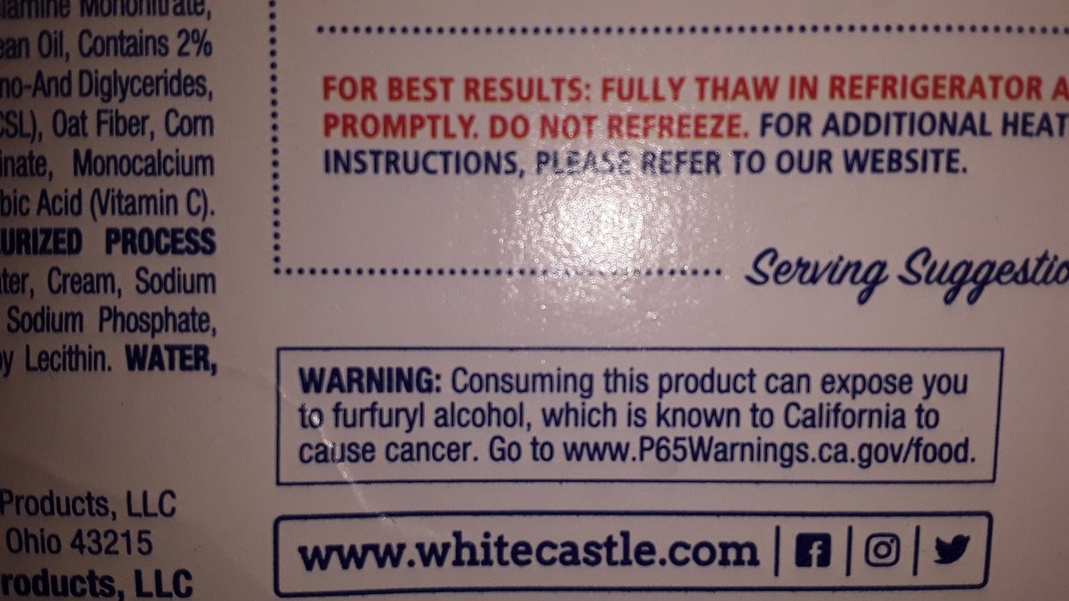 Frozen white castle burgers cancer. When I got them home and opened them up I noticed that the wrappers have a Proposition 65 warning on them - ie. White Castle frozen sandwiches are sold in rectangular cardboard packages and the code date is located on a side panel.